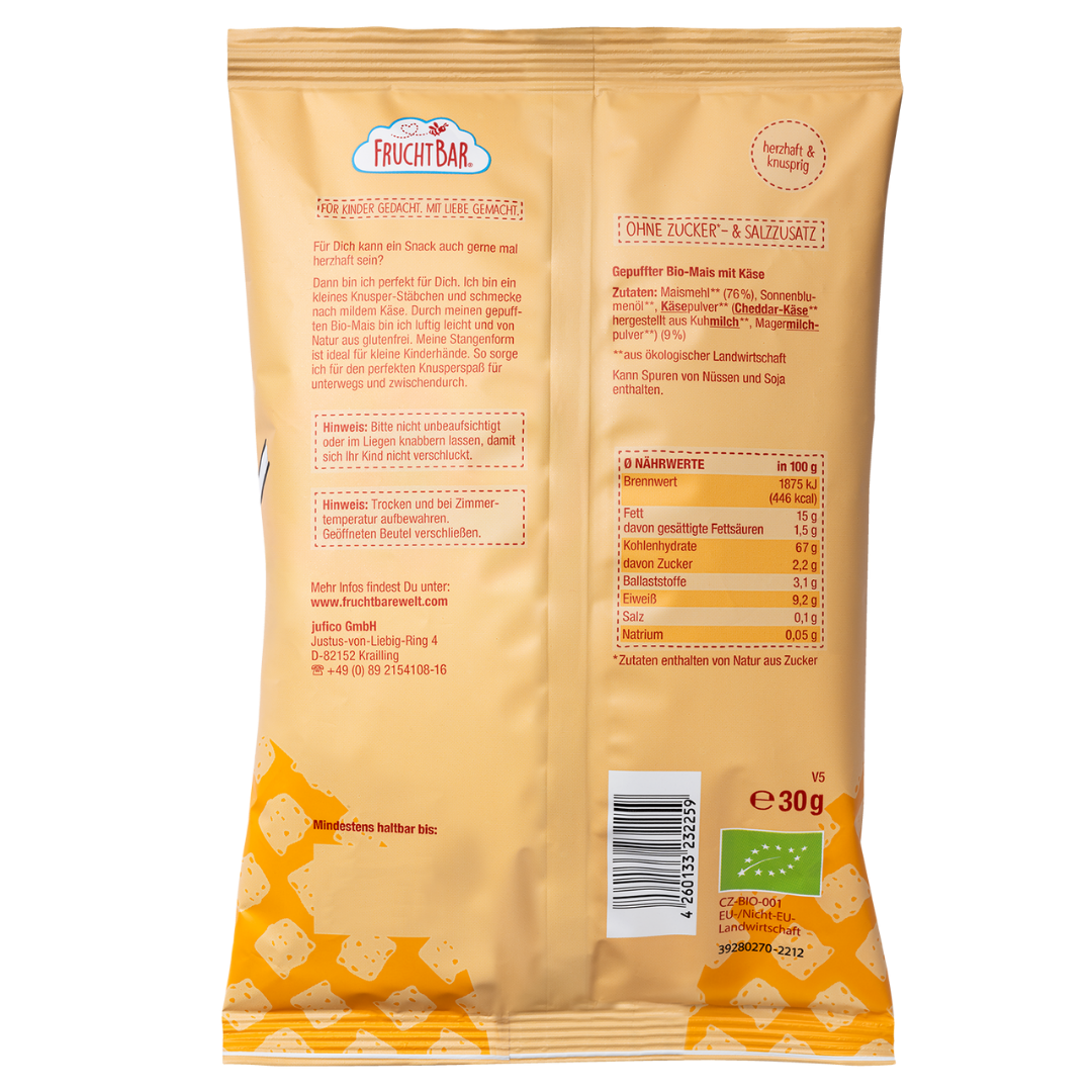 Die Bio Knusper Stäbchen mit Käse und Mais schmecken mild würzig und sorgen für knusprigen Knabberspaß. Die luftige Textur eignet sich gut für kleine Entdecker ab 12 Monaten. Der Snack ist von Natur aus glutenfrei und kommt ohne Zucker- oder Salzzusatz aus.